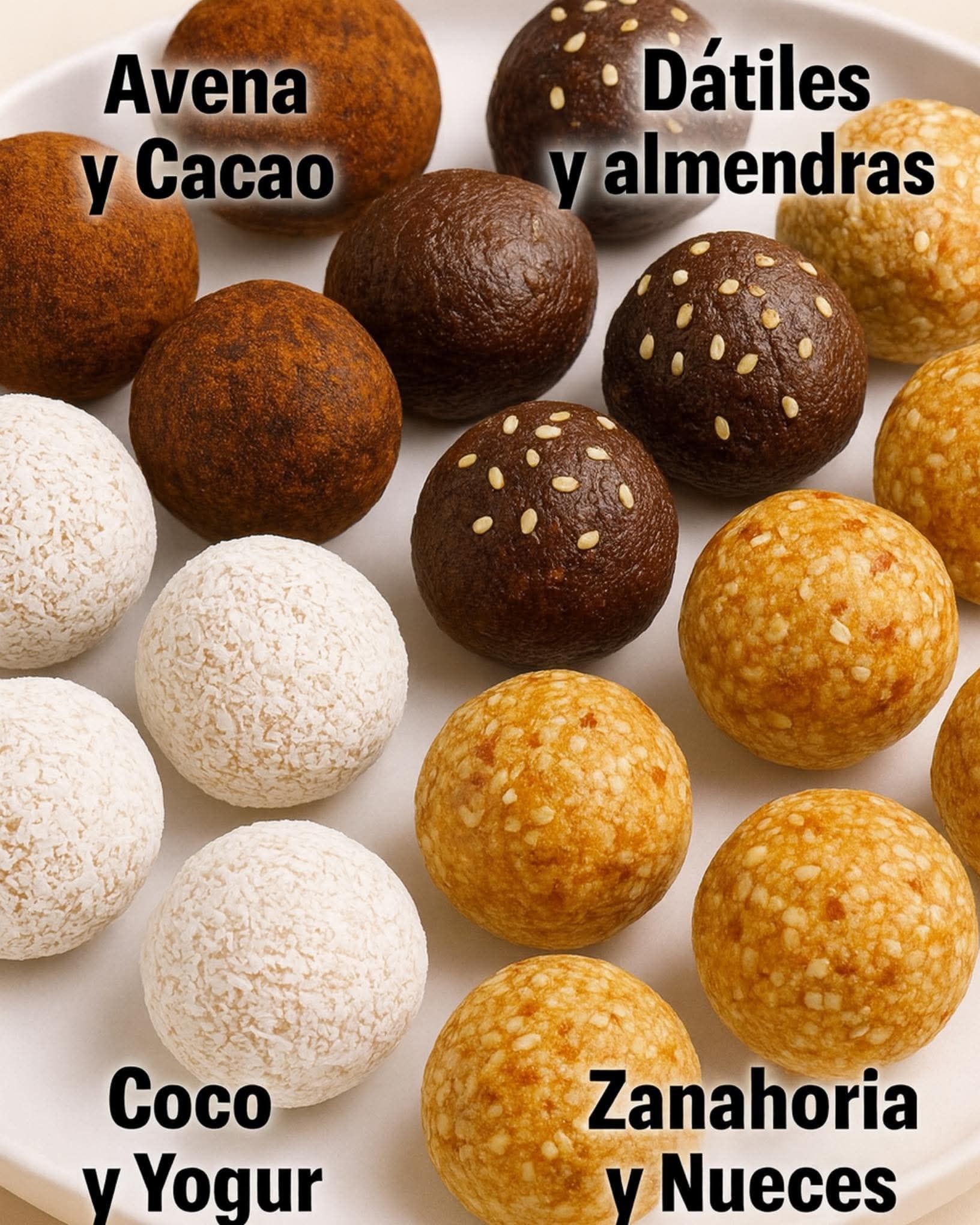 Estas trufas llevan un saborcito diferente y quedan riquísimas. Combiná 1 taza de zanahoria rallada finita, ½ taza de nueces picadas, ½ taza de avena molida y 2 cucharadas de miel. Si la mezcla te queda demasiado húmeda, sumale un poco más de avena hasta lograr una masa que puedas manejar bien con las manos. Con esa mezcla formá las bolitas y, si querés, agregales un toque final de sésamo para que tengan una textura más linda y crocante.