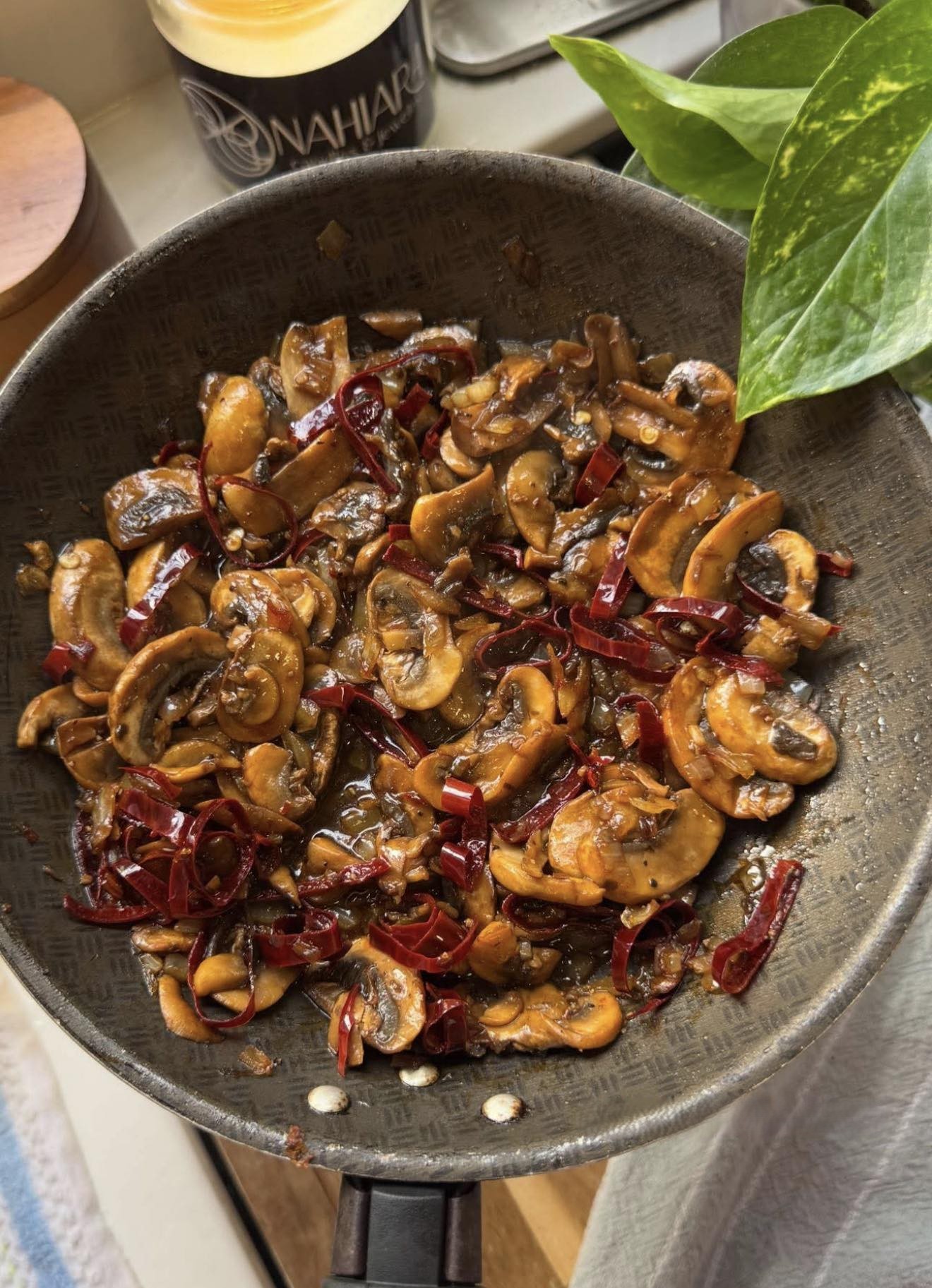 5. Incorpora los champiñones, sazona con sal y pimienta, y saltea a fuego medio-alto hasta que suelten su jugo y se doren ligeramente.